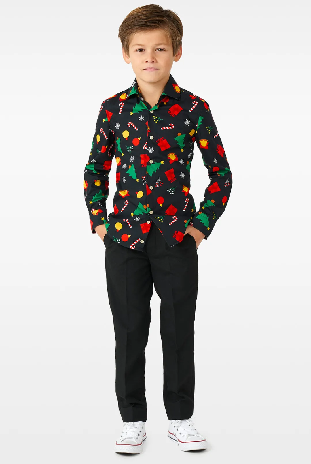 Most Kids Don’T Like To Wear Formal Wear, But Not In This Case. Once He’Ll See This Shirt With Festive Christmas Icons, He’Ll Put It On Right Away. It’s Fun, Stylish And Comfy So It Basically Has Everything You Need For The Holiday Season.