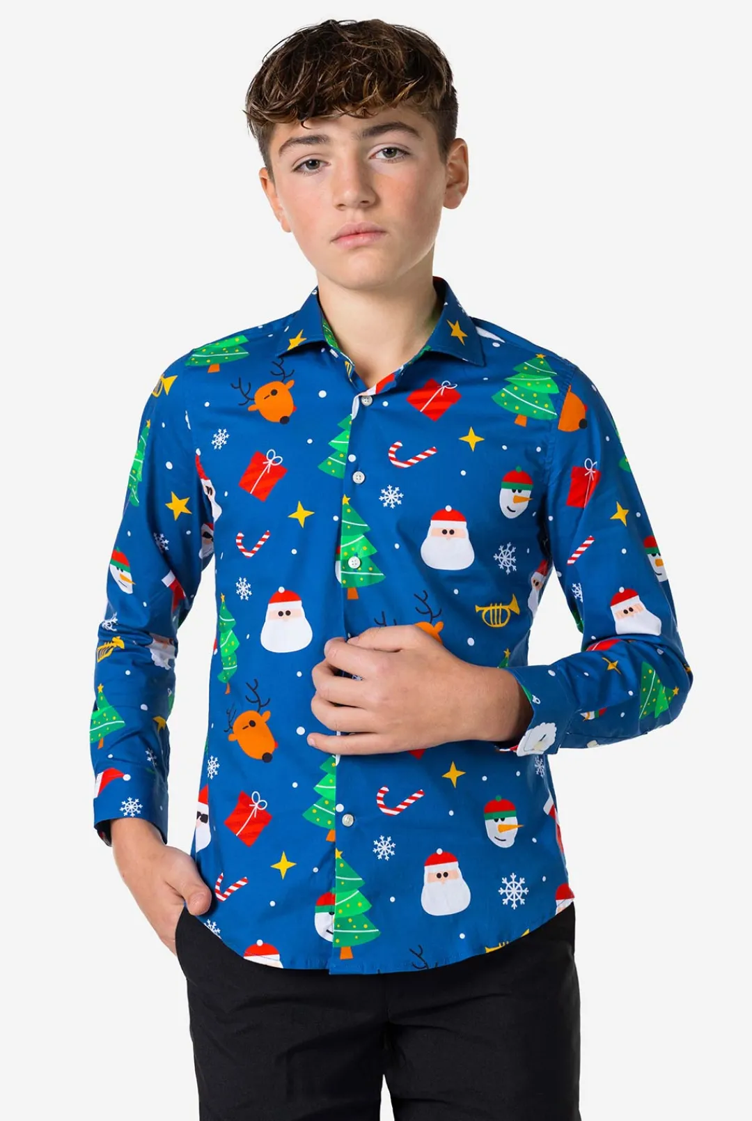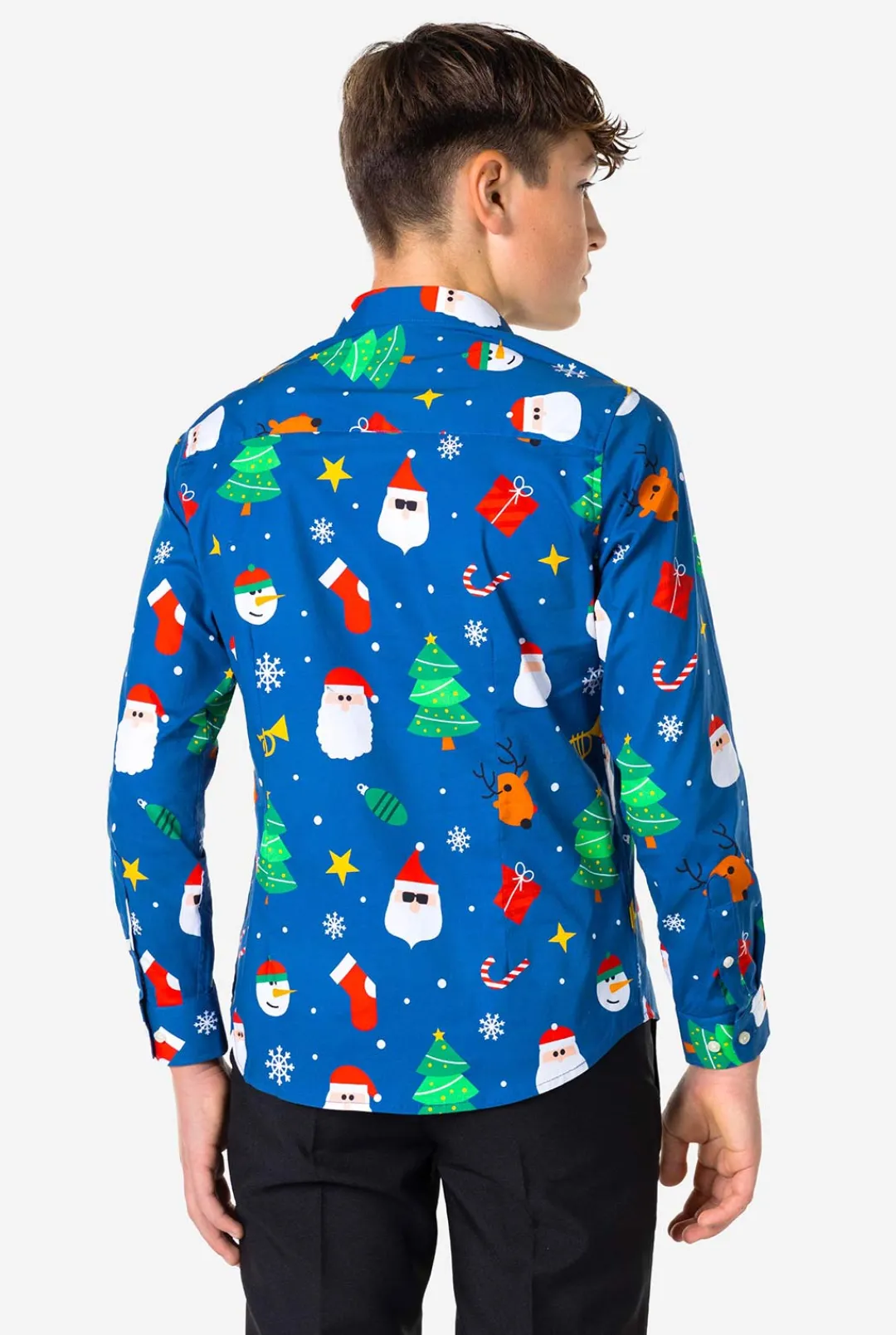 Does Your Kid Want To Look Extra Cool And Stand Out This Holiday Season? Look No Further Than The Blue Festivity Shirt. It Has Santa, Reindeer, Christmas Trees And Glittering Stars, So It’s Perfect To Wear In Combination With A Suit. All It Needs Is You Wearing It!