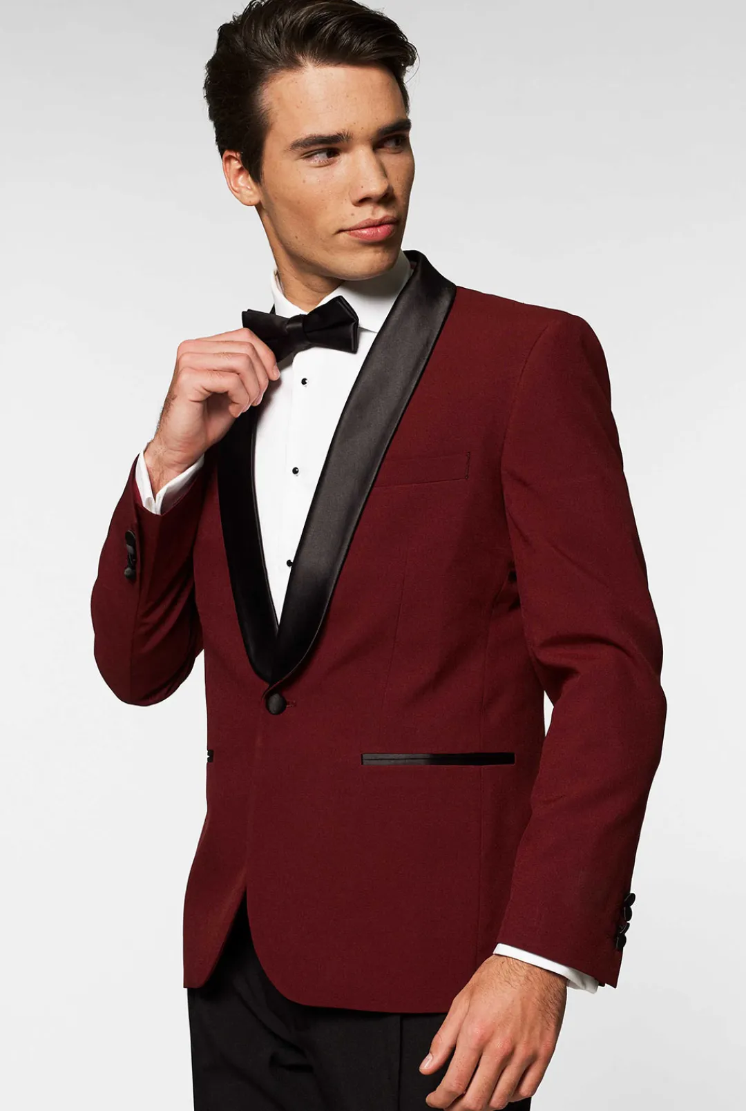 This Tuxedo With A Burgundy Jacket With A Satin Shawl Lapel, Black Pants With A Double Pleat And A Bow-Tie Is The Perfect Outfit For Gents Who Don’T Like To Play Strictly By The Rules. It’s Not In Line With The Black-Tie Dress Code, But At The Same Time Undeniably Distinguished And Stylish, Which Definitely Lets You Get Away With It. From Weddings To Formal Dinners, This Tux Is One You’Ll Be Wearing And Enjoying For Numerous Special Occasions In The Years To Come.