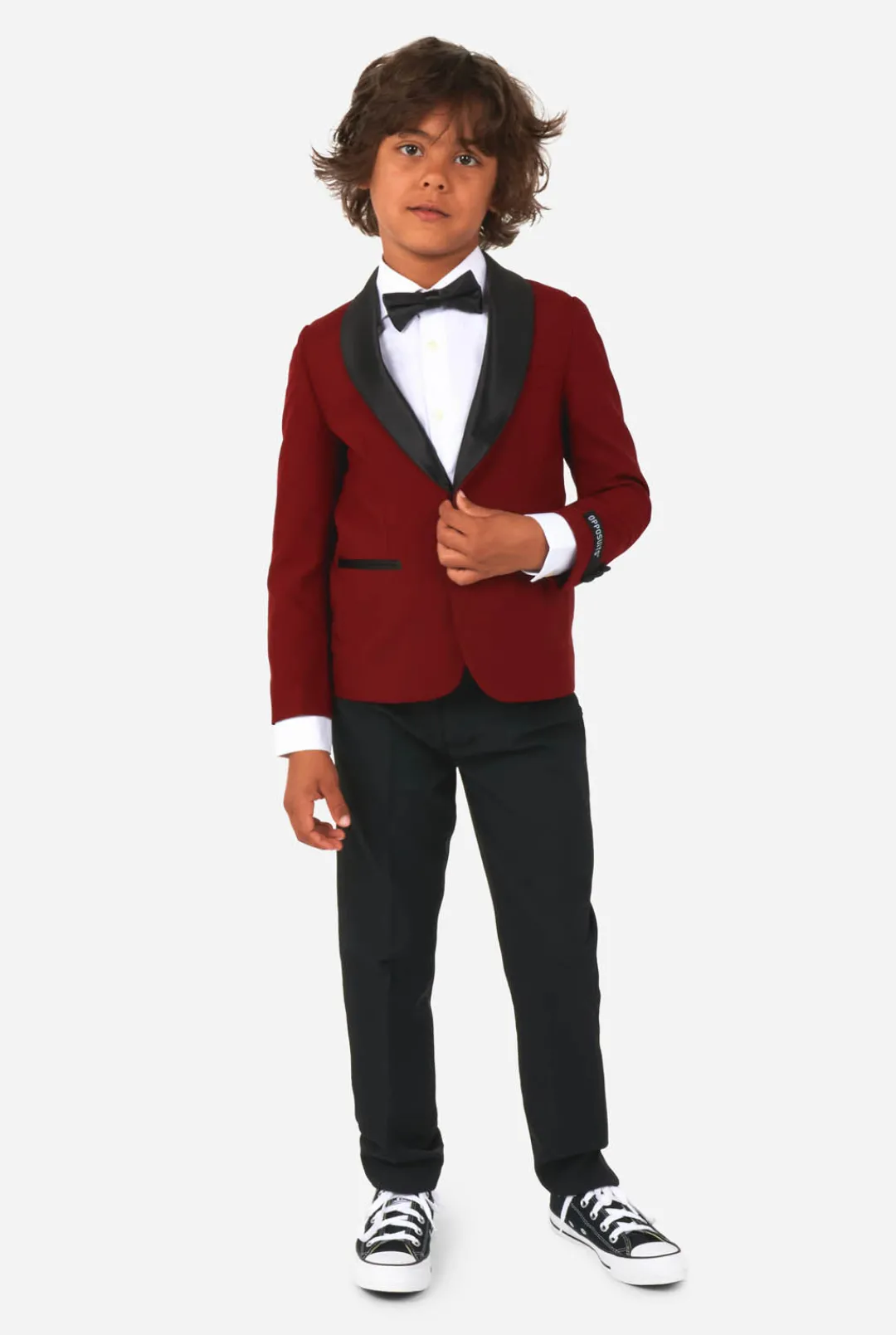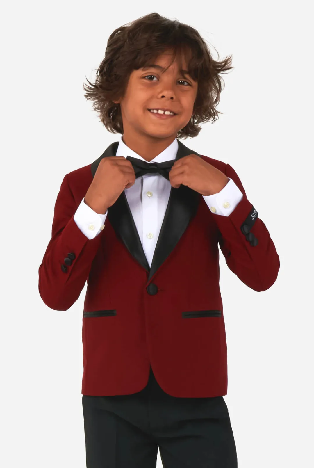 This Smoking Tuxedo With A Burgundy Jacket And Satin Shawl Lapel, Black Pants With A Double Pleat And A Bow-Tie Is The Perfect Outfit For Little Gents Who Don’T Like To Play Strictly By The Rules. From Weddings To Formal Dinners, This Tux Is One They’Ll Be Wearing And Enjoying For Numerous Special Occasions In The Years To Come.