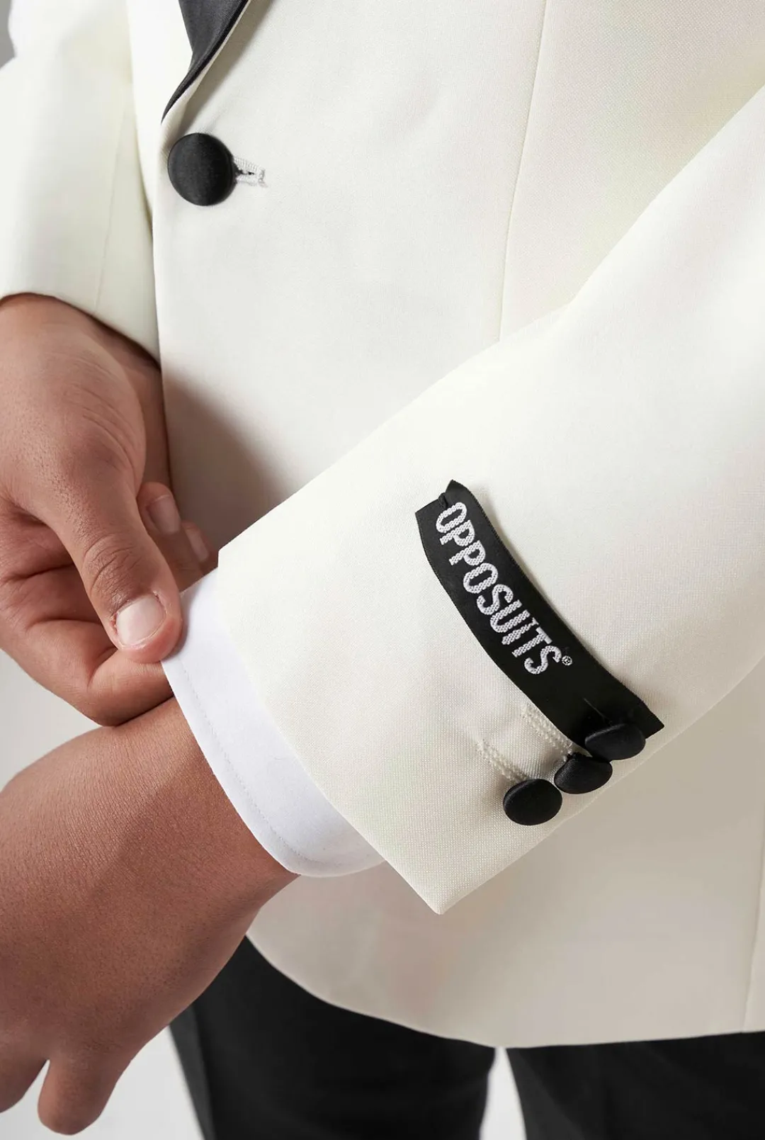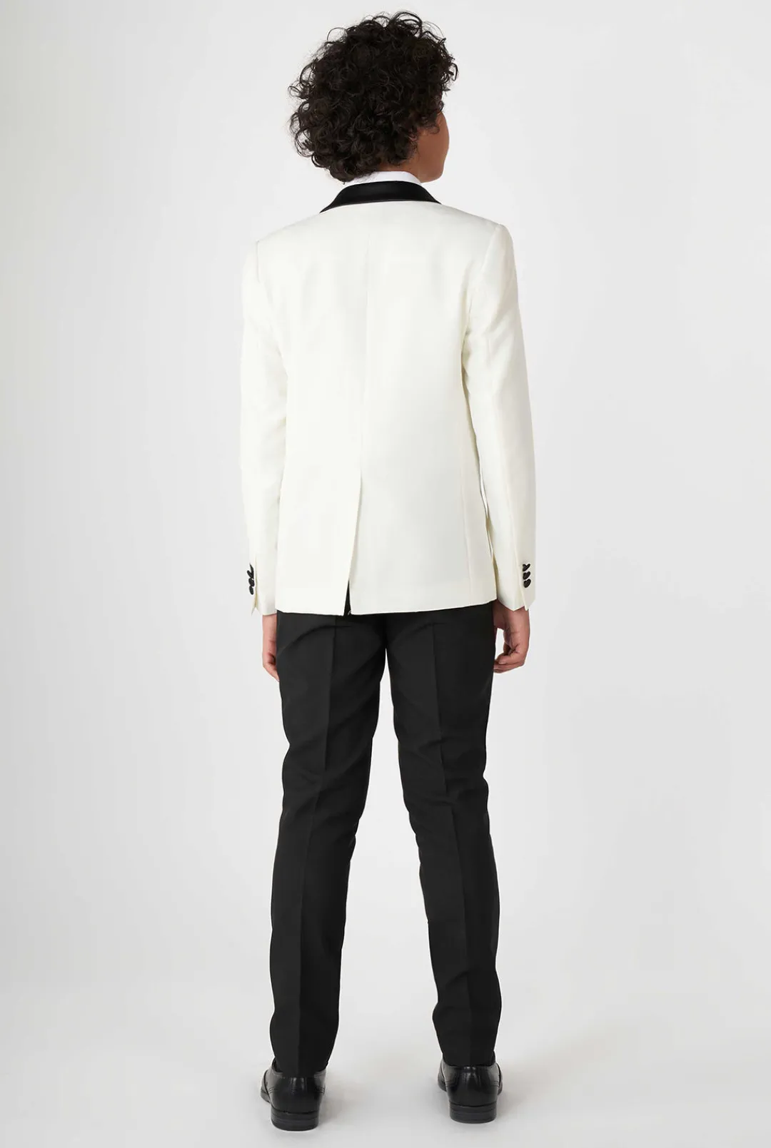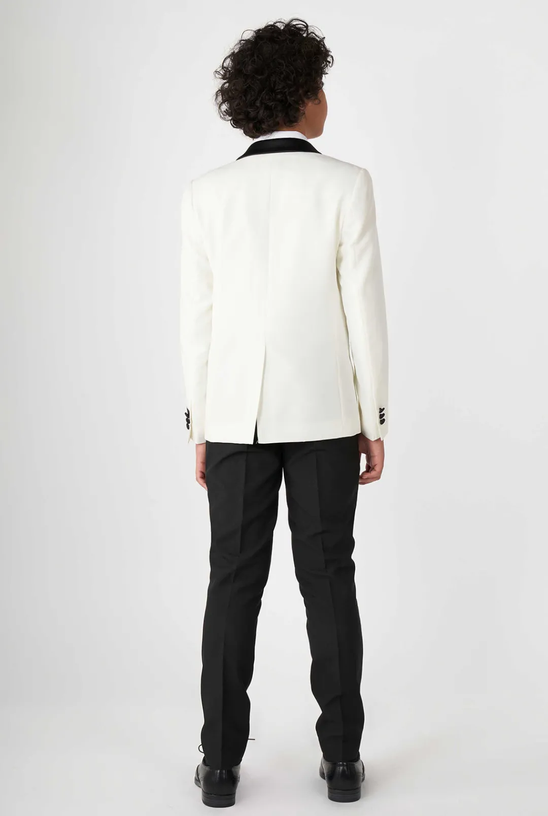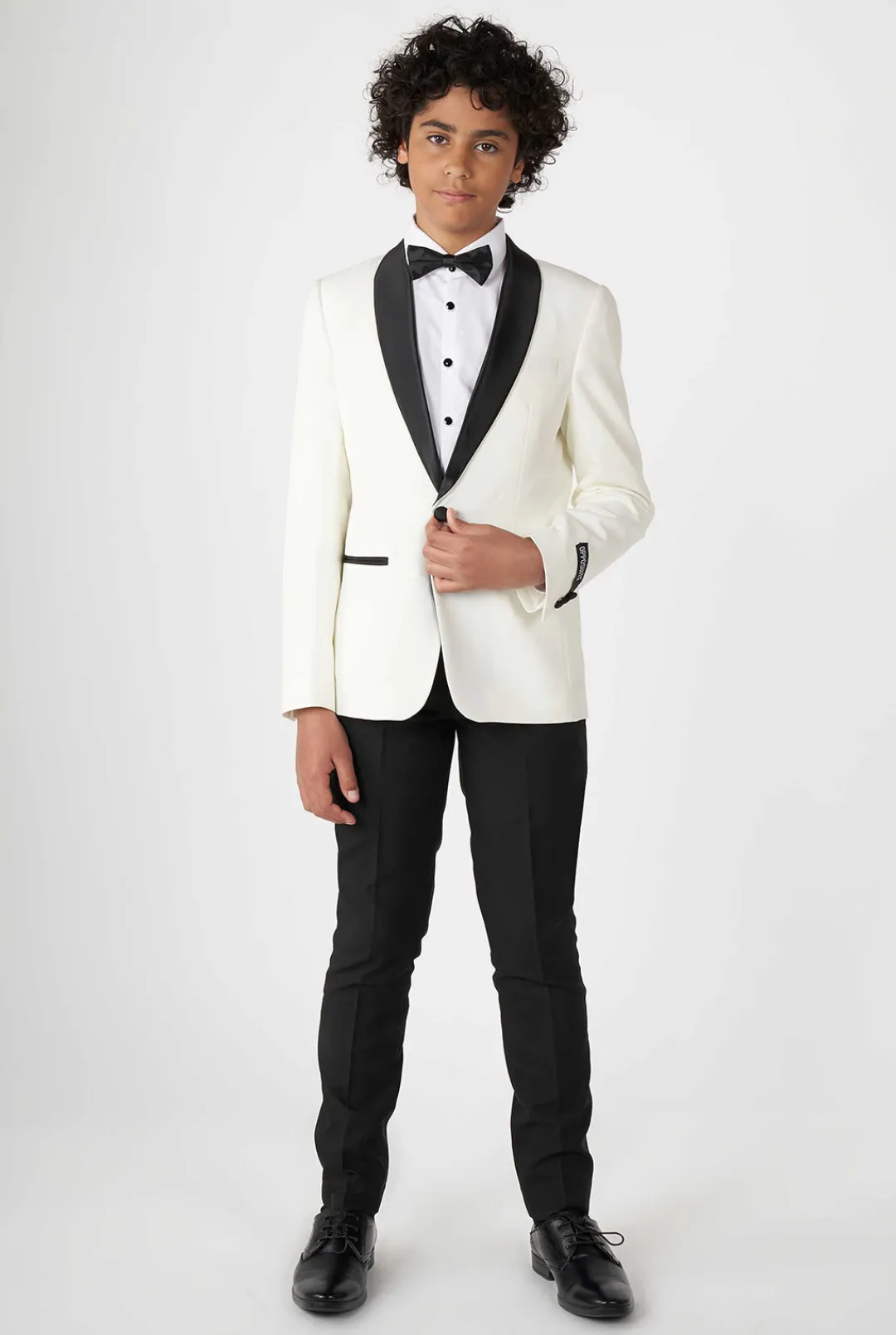 An Off-White Tuxedo Jacket Is One Of The Most Elegant Options For Formal Wear, No Matter How Old You Are. Paired With Black Tuxedo Pants With A Double Pleat And A Bow Tie, Your Little Man Will Be An Absolute Stunner At The Next Family Party.